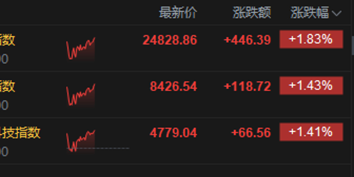 3月24日消息,港股三大指数集体上涨。截至午间收盘,恒生指数涨1.83%,报24828.86点,恒生科技指数涨1.41%,国企指数涨1.43%。盘面上,科网股涨多跌少,联想涨超3%,美团涨超2%;黄金股回暖,赤峰黄金涨超7%;生物医药股普涨,药明康德涨超8%;今日两只新股上市,凯乐士科技涨超81%,泽景股份跌超30%。