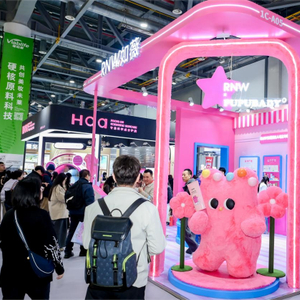 展会现场,如薇打造沉浸式「治愈空间」,成为全场人气打卡地。展位以奶噗噗标志性的小荧粉为主视觉,巨型玩偶装置、卡通立牌、趣味互动镜子、奶噗噗人偶等元素全方位营造柔软治愈的氛围,完整呈现联名全系列产品矩阵与限定周边。