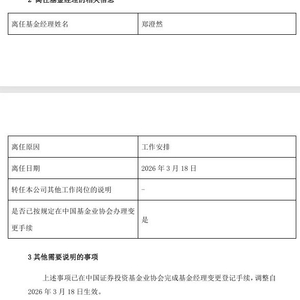 根据广发基金公告,郑澄然因工作安排卸任广发成长动力三年持有基金。资料显示,该基金自2022年7月26日至2026年3月18日由郑澄然管理,苏文杰于2025年7月2日加入,与其共同管理。