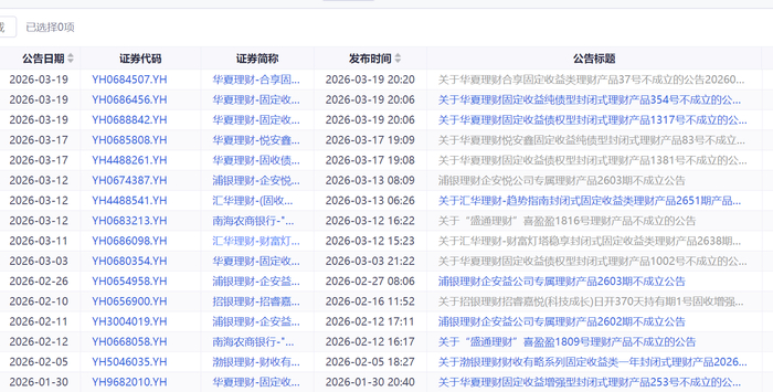 3月19日,华夏理财公告称:华夏理财合享固定收益类理财产品37号因募集总金额未达到产品说明书约定的发行规模下限,产品不成立。通过华夏理财购买的,公司将于原定成立日(2026年3月19日)后2个工作日内将已募集资金退回华夏银行/华夏理财客户的理财签约账户;通过其他代销机构购买的,客户已募集资金退回的具体到账账户、到账日及到账时间以代销机构划付规定为准。