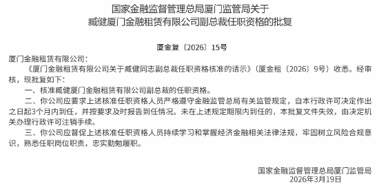 3月24日金融一线消息,国家金融监督管理总局厦门监管局发布批复,