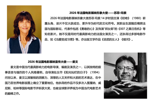 22年来,伊莎贝尔・于佩尔、让・雷诺、朱丽叶・比诺什、蕾雅・赛杜等法国电影人,克洛德・勒卢什等电影大师都曾通过影展来华;葛优、贾樟柯、陆川、章子怡等中国知名电影人都曾担任展映代言人,它早已成为中法文化领域交流的核心平台。2026年的光影盛宴特邀苏菲・玛索担任形象大使,姜文担任宣传大使,两位中法影坛的重量级人物联袂助阵,为影迷带来一场诚意拉满的法兰西电影之旅。