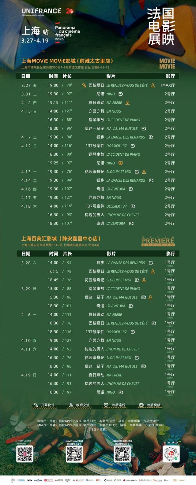 其中,上海站将于3月27日至4月19日在MOViE MOViE影城和百美汇影城(静安嘉里中心店)举行,并于3月24日中午12点开票。除了完整片单放映,本次上海站展映期间,有多部影片配置重磅映后活动:《巴黎夏日》将由导演瓦伦丁・卡迪奇亲临两场现场交流;《花园编舟记》邀请法国影视联盟总经理唐莉安、诗人胡桑分别参与映后;《我这一辈子》邀请国际电影节策展人马可・穆勒对谈;《夏日躁动》由影像艺术家李竞菲到场交流;《尼诺》安排导演波利娜・洛克线上连线互动。此外,《137号案件》《狐步》《奇遇》等影片也配有映后主创的访谈视频,便于观众进一步理解影片。