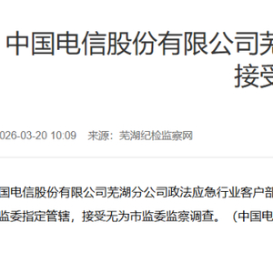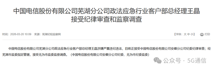 据芜湖纪检监察网消息:中国电信股份有限公司芜湖分公司政法应急行业客户部总经理王晶涉嫌严重违纪违法,目前正接受中国电信股份有限公司安徽分公司纪委纪律审查;经芜湖市监委指定管辖,接受无为市监委监察调查。