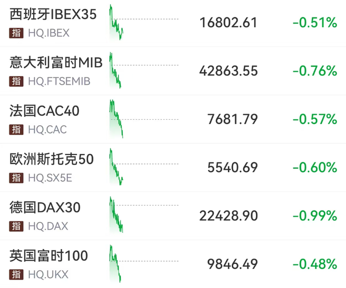 【导读】欧洲主要股指集体走低