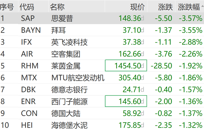 德股方面,空客集团、莱茵金属、MTU航空发动机等跌幅居前。