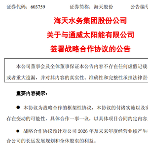 3月23日盘后,海天股份发布《关于与通威太阳能有限公司签署战略合作协议的公告》称,公司于2026年3月23日与通威太阳能以书面方式签署战略合作框架协议。