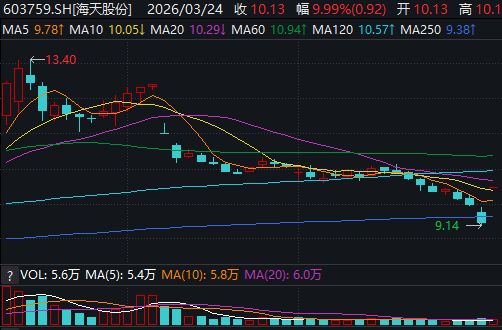 二级市场上,受消息利好提振,海天股份3月24日直接涨停开盘并持续到收盘,全日换手率1.22%,成交量的萎缩显示出资金惜售心理明显。