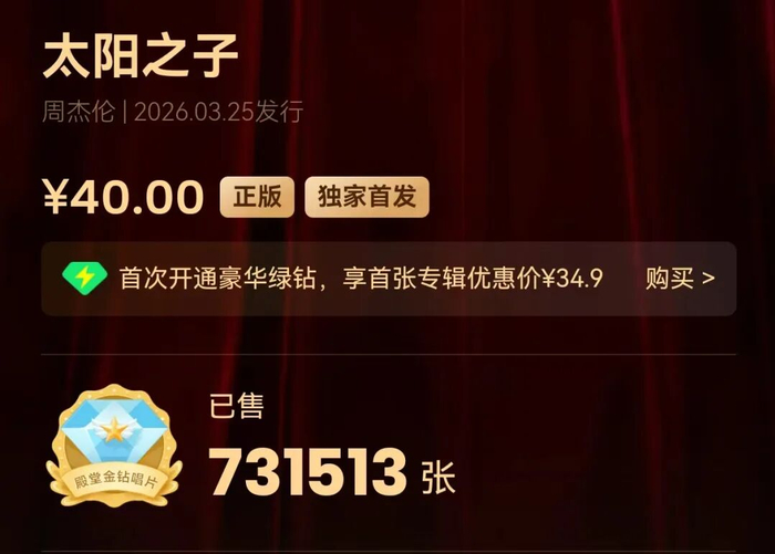 值得一提的是,3月19日13时,周杰伦新专辑《太阳之子》数字专辑预购正式开启,收录13首歌曲。QQ音乐平台显示,该专辑在13时07分,销量突破12500张,仅用14分钟即获得了三金唱片认证。在14时41分,售出超7.5万张,达到平台三白金唱片认证。