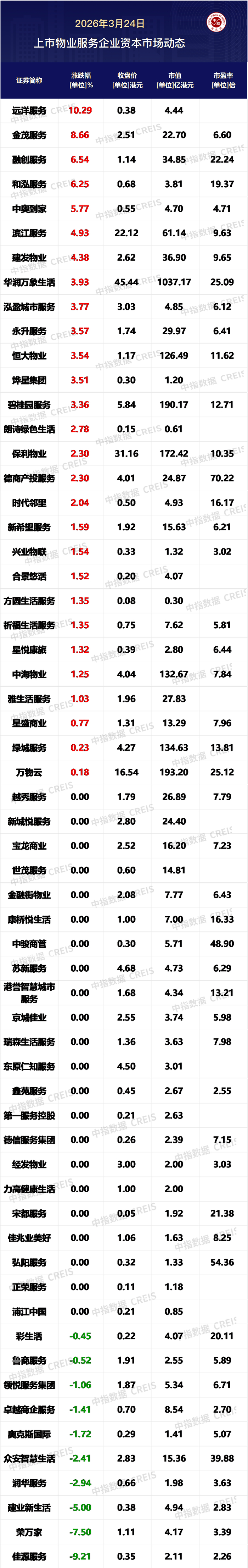 3月24日,恒生指数,收盘上涨681.24点,涨幅约为2.79%,报收25063.71点。今日60家港股上市物业服务企业中28家上涨。远洋服务涨幅为10.29%,位列今日港股物业服务板块第一位。