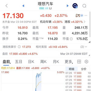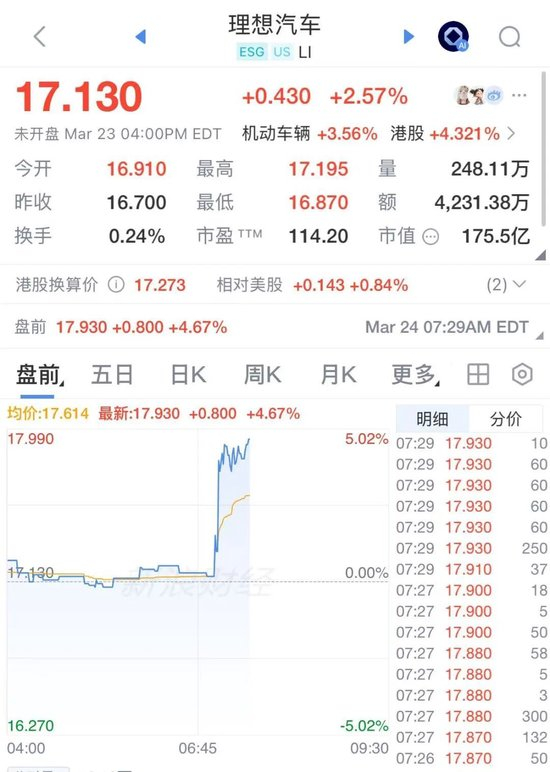 3月24日晚,理想汽车美股盘前直线拉升超4%。