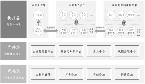 研究通过酷开科技的转型案例,生动展示了新范式的威力。在传统分工模式下,一张电影推荐海报的上线,需要策划、设计、审核、运营四个岗位像接力赛一样串行协作。沟通误解、反复修改、合规返工是家常便饭。企业智能体架构采用三层次模型:设施层以大模型作为认知引擎,配以算力、存储、网络支撑;支持层将能力封装为标准服务,包括智能体平台、数据知识平台、工具平台、规则治理平台;执行层整合战略智能体、员工智能体、客户智能体等,实现数据和流程协同。而在引入端到端智慧体后,这一链条被压缩为一个点。结果令人震撼:日均海报产量从2,000张暴增至30,000张,提升了15倍;人力成本降低了80%;且实现了100%的合规率。更具代表性的是,在除夕夜面对电影《哪吒》的突发热度,智慧体在无人工干预的情况下,毫秒级完成了从捕捉舆情到生成海报、调整推荐位的全过程决策——这在传统分工模式下是不可想象的。