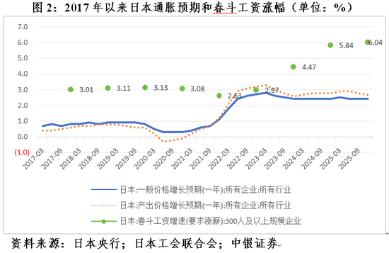日本通胀开始爆表时,正值以美联储为代表的全球主要央行激进紧缩抗通胀。然而,直至观察到国内通胀预期抬升、“工资-物价上涨”的螺旋确认(见图2),日本央行才于2024年3月提高政策目标利率20个基点至0.1%,退出了负利率时代。此后,分别于2025年8月加息15个基点,2026年1月和12月各加息25个基点,并逐步减少购债,稳步推进货币政策正常化进程。
