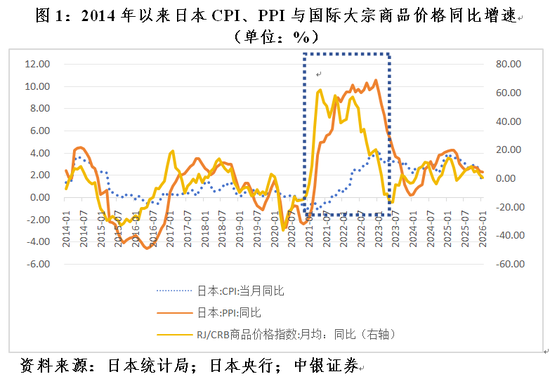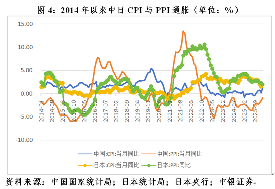 中国和日本对大宗商品进口均有一定的依赖度,只是程度不同。日本是一个资源贫乏的国家,原油、铁矿石、铜铝的进口依存度均接近100%,而中国为65%~85%;日本煤炭的进口依存度为82%~90%,而中国只有5.7%。相关性分析显示,2018年1月至2026年2月,中国PPI通胀与国际商品价格通胀〔以路透/美国商品研究局(RJ/CRB)月均商品价格指数同比变动衡量〕为中等程度正相关0.718,日本为强正相关0.813(见图3)。日本的正相关性高于中国,显示日本因进口依存度更高,输入性通胀效应更为明显。