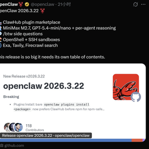 当地时间3月23日,OpenClaw在沉寂9天后推出了v2026.3.22版本更新。本次更新对插件系统进行了重构,上线全新公开插件SDK(软件开发工具包),在模型配置上升级到GPT-5.4和MiniMax-M2.7等最新模型,并在安全方面进行了加固。