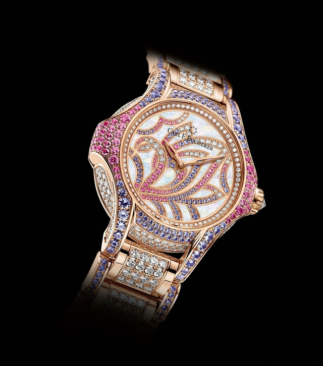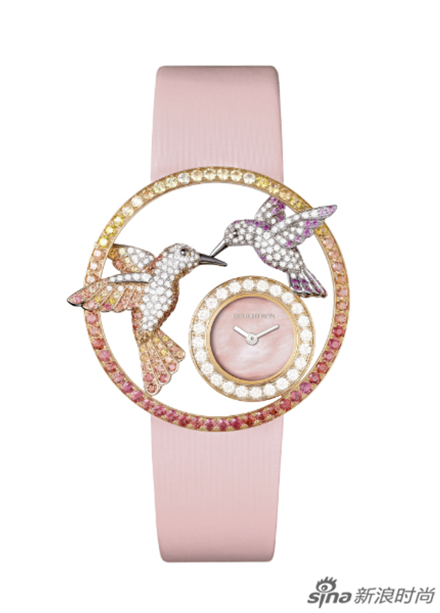 4/13 宝诗龙AJOUREE镂刻系列Hopi蜂鸟腕表。由钻石、粉色及橙色蓝宝石3D铺镶而成的两只蜂鸟振翅于钻石表盘,粉色珍珠母贝表盘及拉绒粉色缎面表带尽显温柔。
