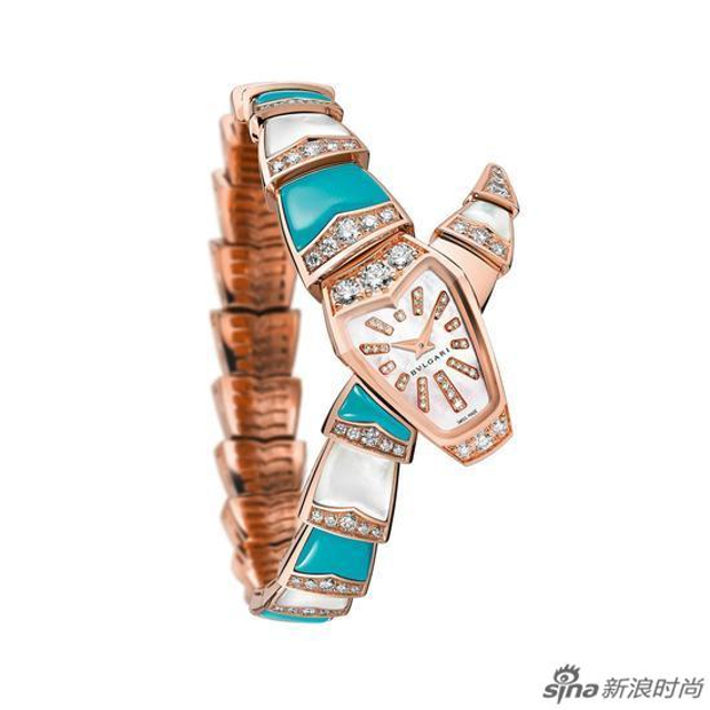 7/13 宝格丽Serpenti珠宝腕表。经典的灵蛇设计头尾相接,是腕表也是手镯,珍珠母贝和绿松石嵌于玫瑰金材质表链,一排排精致的钻石点缀缤纷闪亮。