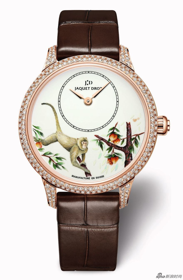 9/13 雅克德罗猴年生肖腕表。表圈镶嵌璀璨钻石,象征着智慧和长寿的猕猴奔向桃枝,意欲摘桃,画面充满诗意,栩栩如生。