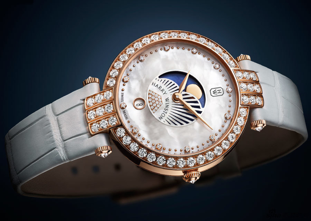 11/13 海瑞温斯顿卓时Premier系列36毫米月相功能腕表。雅致的珍珠母贝表盘搭配月相复杂功能,宛如一抹明月绽放光芒于表盘中。