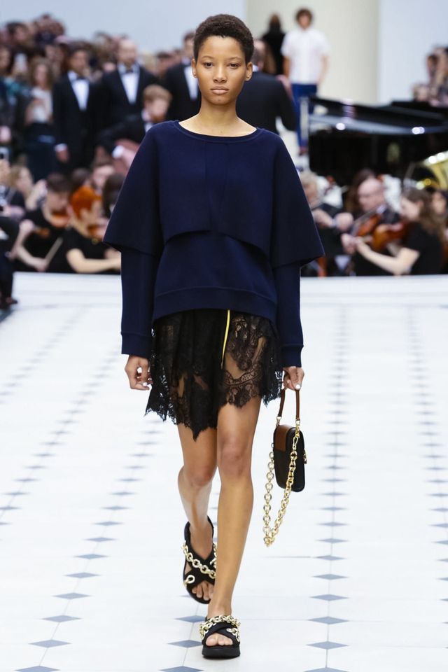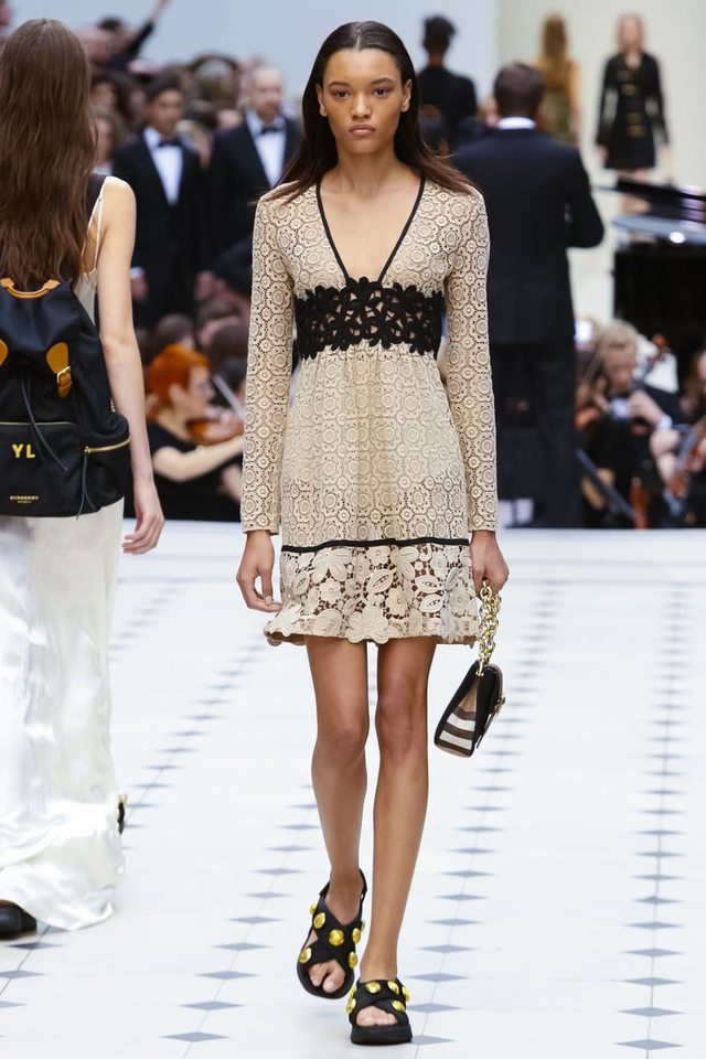 25/48 Burberry 2016春夏大秀呈现浓浓的英式军装风,若隐若现的全镂空蕾丝作为主打元素点亮整个秀场,舒适的拖鞋和编制风格的高跟交替呈现,在休闲与性感之间无缝穿越。