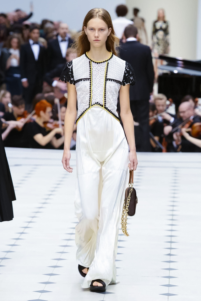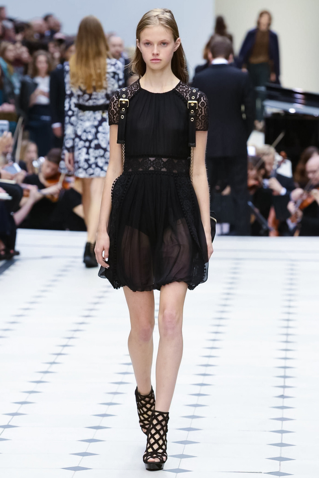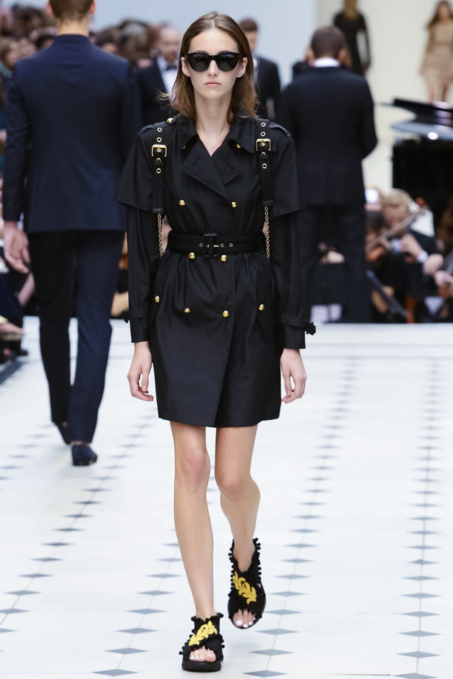 13/48 Burberry 2016春夏大秀呈现浓浓的英式军装风,若隐若现的全镂空蕾丝作为主打元素点亮整个秀场,舒适的拖鞋和编制风格的高跟交替呈现,在休闲与性感之间无缝穿越。