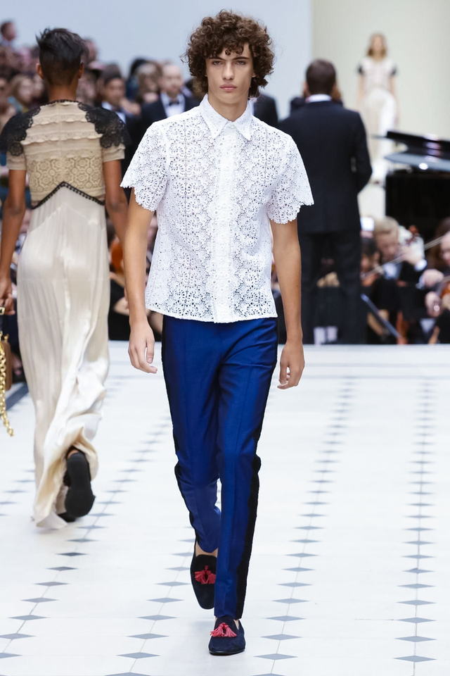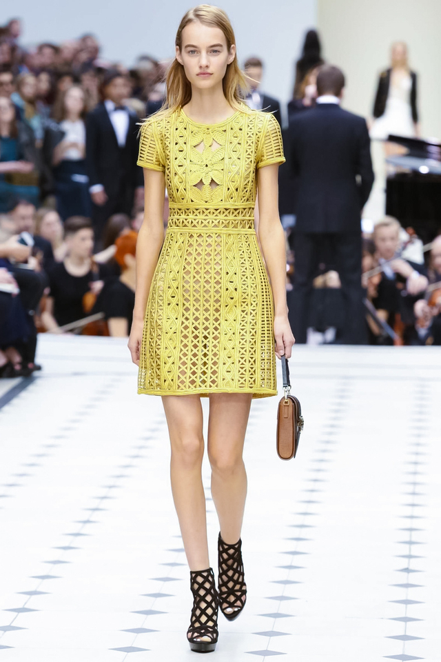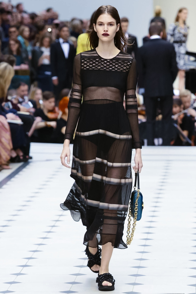 15/48 Burberry 2016春夏大秀呈现浓浓的英式军装风,若隐若现的全镂空蕾丝作为主打元素点亮整个秀场,舒适的拖鞋和编制风格的高跟交替呈现,在休闲与性感之间无缝穿越。