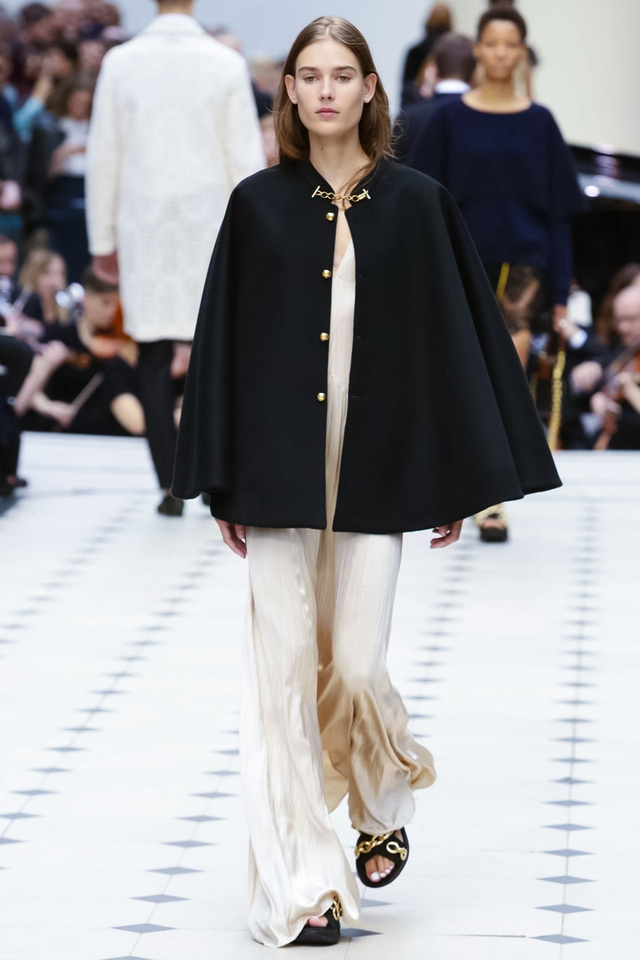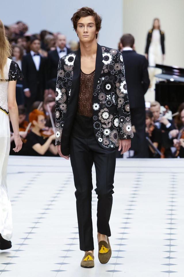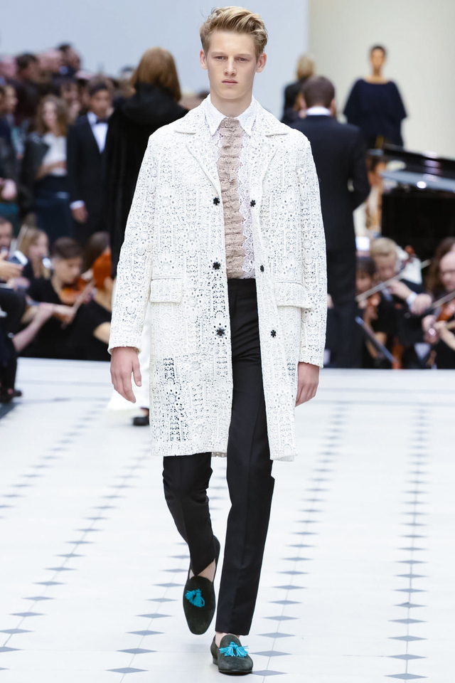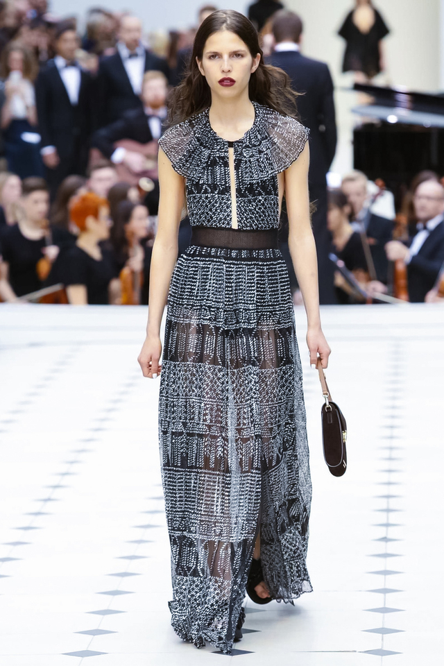 24/48 Burberry 2016春夏大秀呈现浓浓的英式军装风,若隐若现的全镂空蕾丝作为主打元素点亮整个秀场,舒适的拖鞋和编制风格的高跟交替呈现,在休闲与性感之间无缝穿越。