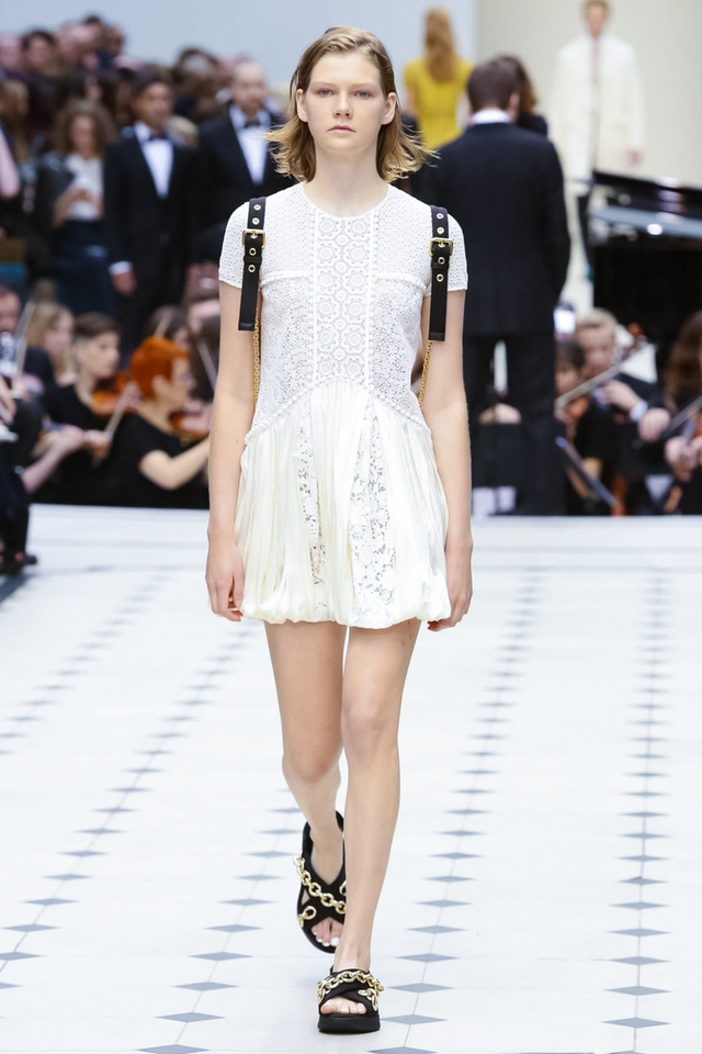 38/48 Burberry 2016春夏大秀呈现浓浓的英式军装风,若隐若现的全镂空蕾丝作为主打元素点亮整个秀场,舒适的拖鞋和编制风格的高跟交替呈现,在休闲与性感之间无缝穿越。