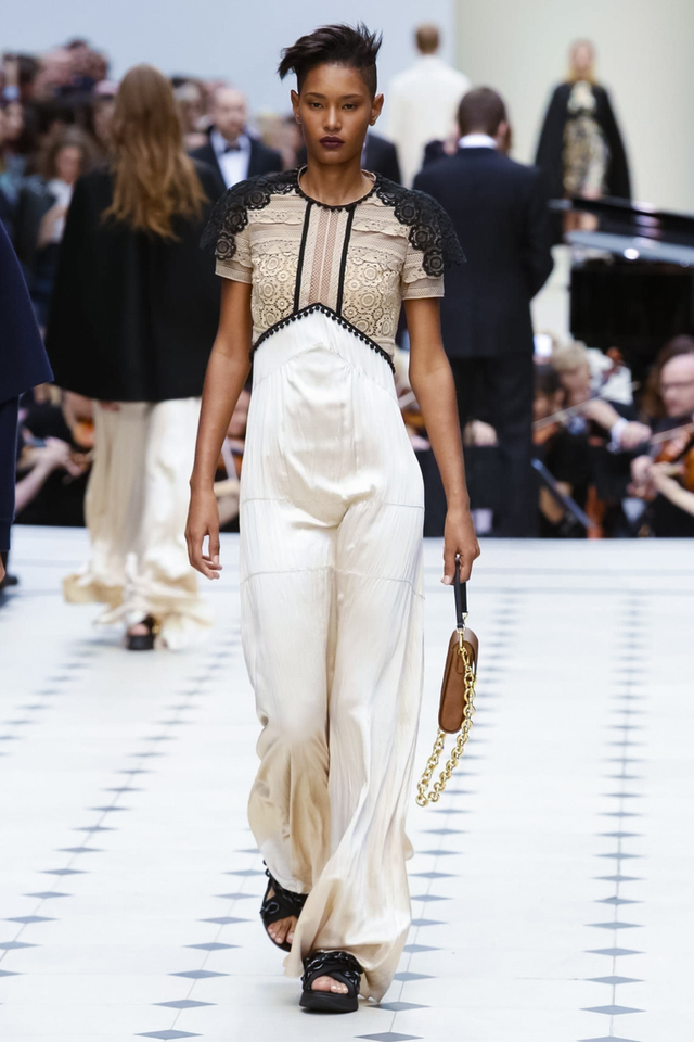 31/48 Burberry 2016春夏大秀呈现浓浓的英式军装风,若隐若现的全镂空蕾丝作为主打元素点亮整个秀场,舒适的拖鞋和编制风格的高跟交替呈现,在休闲与性感之间无缝穿越。