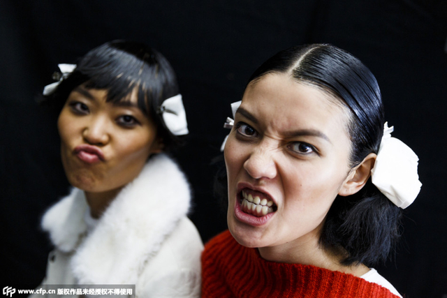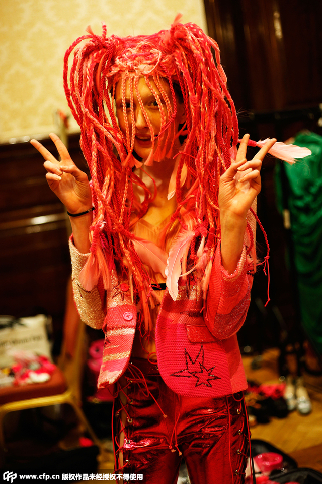 2/26 所谓设计师 ,不光是要在服装上做功课,发型,彩妆,饰品都要操心,就连头套都要不得不博人眼球。后台模特也是不闲着,各种伸舌搞怪,时装周真是欢乐的海洋。