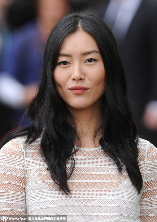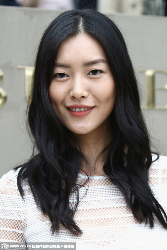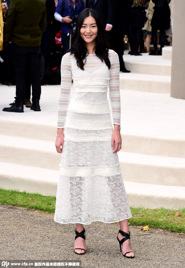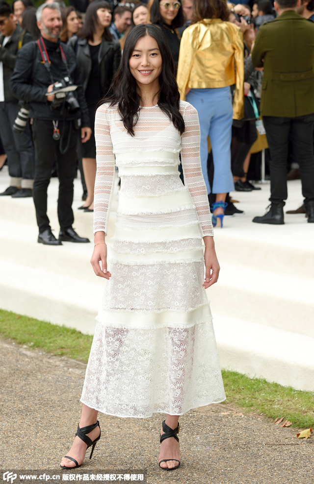 12/15 当地时间9月21日,2016伦敦春夏时装周:Burberry 秀场。刘雯身穿Burberry白色蕾丝镂空透视长袖连衣裙,脚踩黑色高跟凉鞋,一身搭配非常性感。