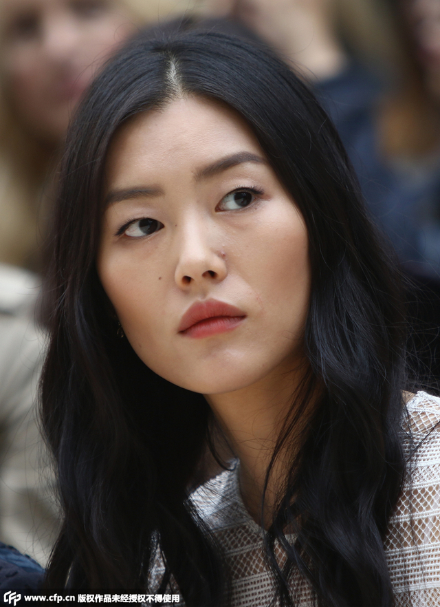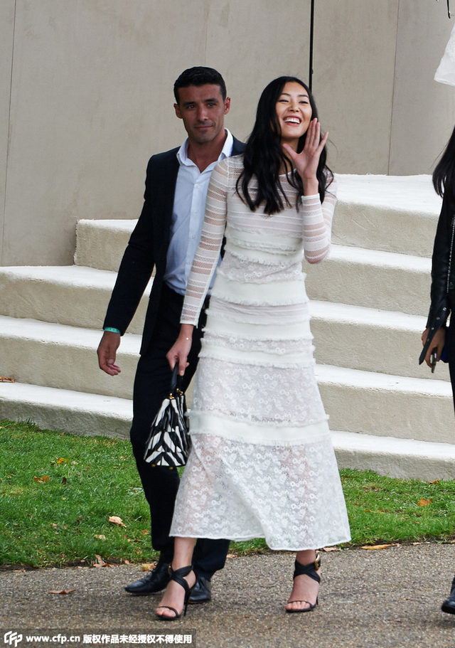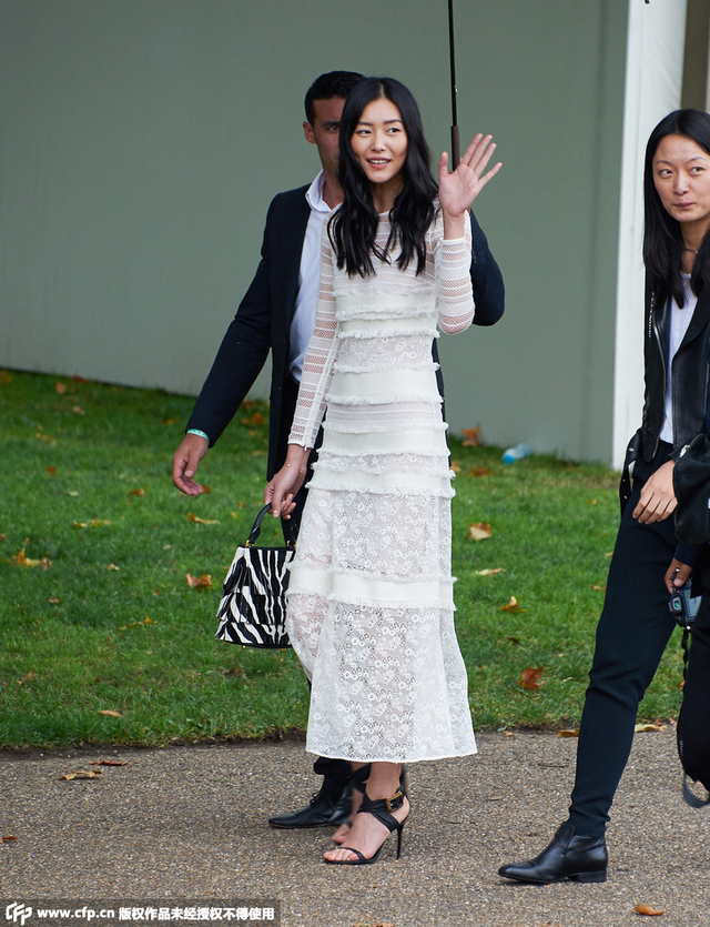 10/15 当地时间9月21日,2016伦敦春夏时装周:Burberry 秀场。刘雯身穿Burberry白色蕾丝镂空透视长袖连衣裙,脚踩黑色高跟凉鞋,一身搭配非常性感。