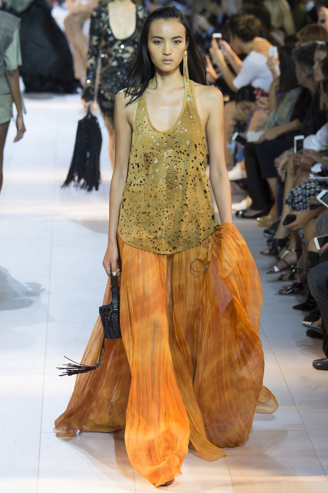51/51 设计师Peter Dundas回归Roberto Cavalli交上的第一份答卷,这一季主要呈现80年代街头风格,日装以随性的工装马甲、夹克为主,晚装则大走性感路线,镂空蕾丝鸡尾酒裙有几分爵士时代的风味。