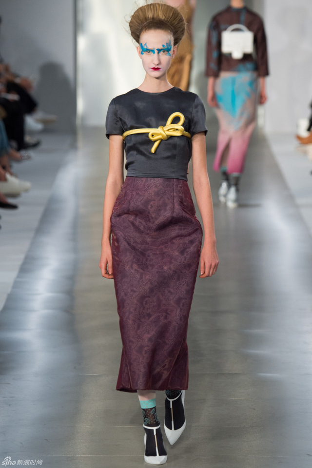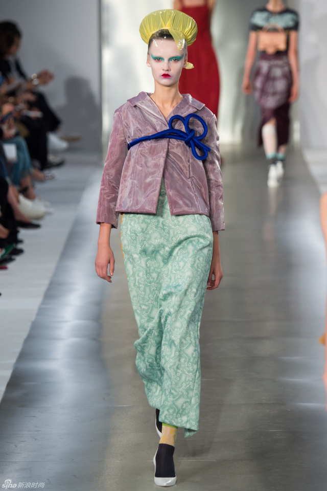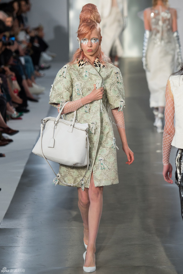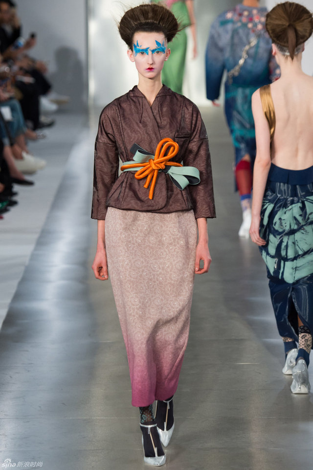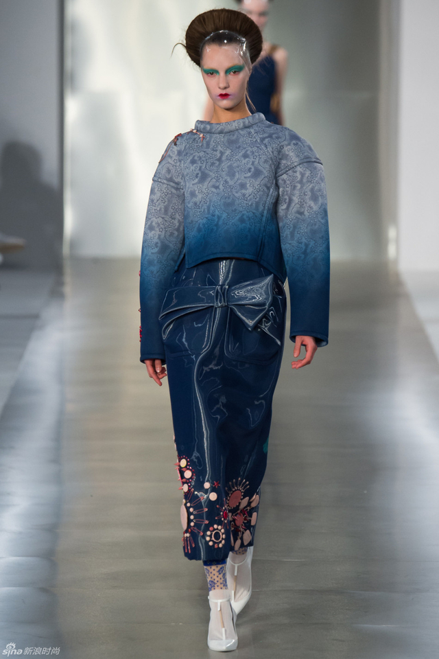 14/33 头裹塑料袋和腿缠保鲜膜的姑娘,告诉你秋冬不减肥春夏徒伤悲。本季Maison Margiela沿用了John Galliano偏爱的东瀛风,和服式腰带在胸前或腰间,东方美学得到了二次解读。