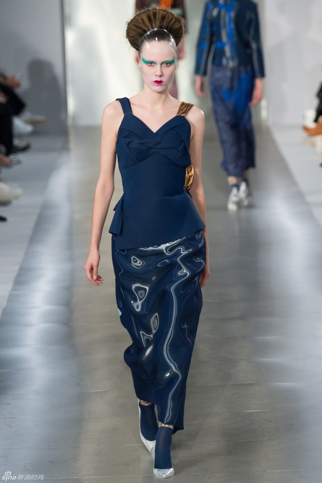 16/33 头裹塑料袋和腿缠保鲜膜的姑娘,告诉你秋冬不减肥春夏徒伤悲。本季Maison Margiela沿用了John Galliano偏爱的东瀛风,和服式腰带在胸前或腰间,东方美学得到了二次解读。