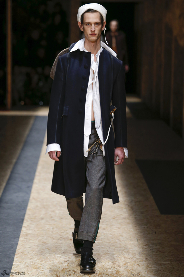 1/56 Prada 2016秋冬男装,不论是配件还是细节都揭示了水手的主题,水手在丰富层次的服装下更加摩登。一直在追求时装与艺术相契合的Prada本季推出了印着画作的白衬衫,让时装本身就成为一种艺术品。本季的Prada的配饰也很丰富,马赛克式色块拼接的袜子和宽肩带的包品让造型更加完整。