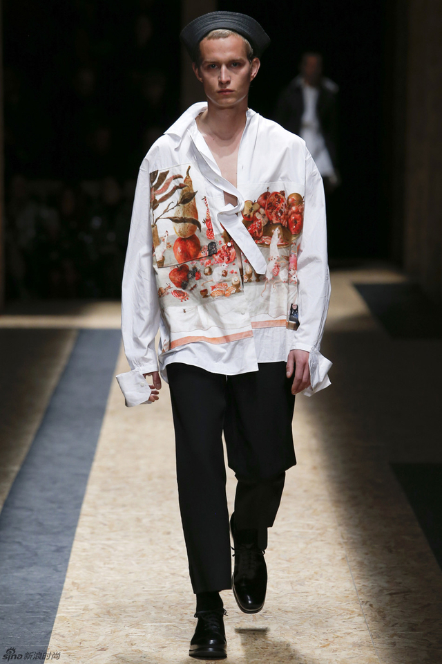 15/56 Prada 2016秋冬男装,不论是配件还是细节都揭示了水手的主题,水手在丰富层次的服装下更加摩登。一直在追求时装与艺术相契合的Prada本季推出了印着画作的白衬衫,让时装本身就成为一种艺术品。本季的Prada的配饰也很丰富,马赛克式色块拼接的袜子和宽肩带的包品让造型更加完整。