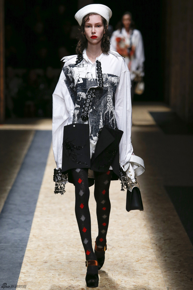 46/56 Prada 2016秋冬男装,不论是配件还是细节都揭示了水手的主题,水手在丰富层次的服装下更加摩登。一直在追求时装与艺术相契合的Prada本季推出了印着画作的白衬衫,让时装本身就成为一种艺术品。本季的Prada的配饰也很丰富,马赛克式色块拼接的袜子和宽肩带的包品让造型更加完整。