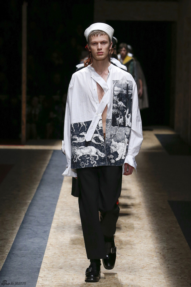 39/56 Prada 2016秋冬男装,不论是配件还是细节都揭示了水手的主题,水手在丰富层次的服装下更加摩登。一直在追求时装与艺术相契合的Prada本季推出了印着画作的白衬衫,让时装本身就成为一种艺术品。本季的Prada的配饰也很丰富,马赛克式色块拼接的袜子和宽肩带的包品让造型更加完整。