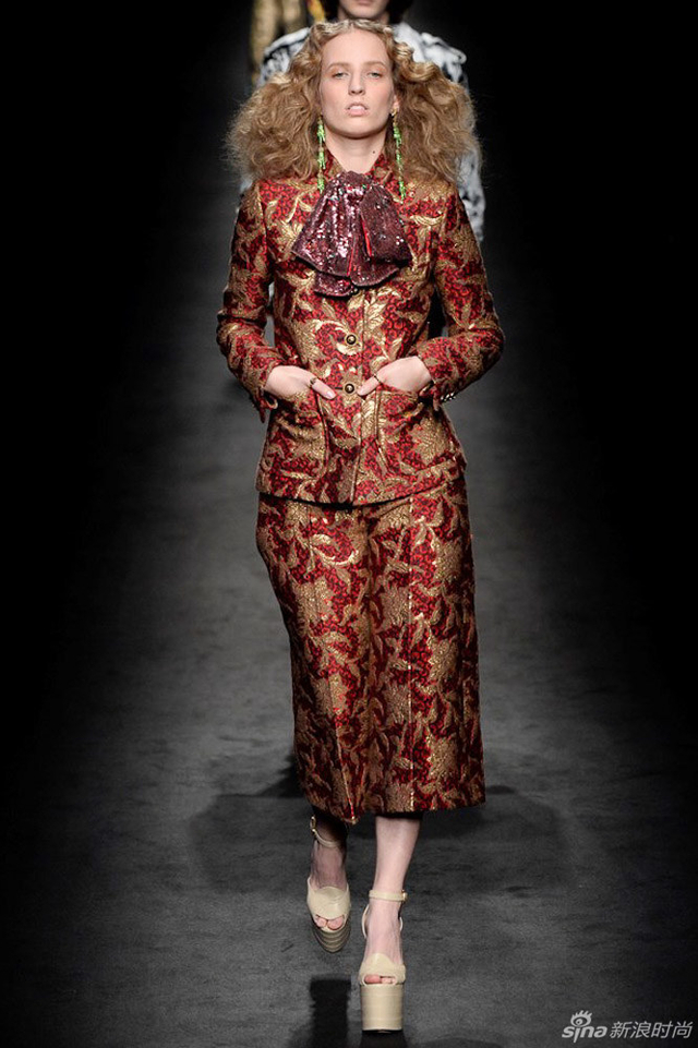 38/72 GUCCI 2016秋冬女装系列从植物的生长中获取灵感,每件服装都描绘出截然迥异的符号系统,有如“块茎思维”一般不断将各种元素串根式重生,并交织在一起,盘错蔓延,产生无以伦比的多样性。