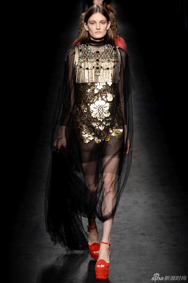 45/72 GUCCI 2016秋冬女装系列从植物的生长中获取灵感,每件服装都描绘出截然迥异的符号系统,有如“块茎思维”一般不断将各种元素串根式重生,并交织在一起,盘错蔓延,产生无以伦比的多样性。