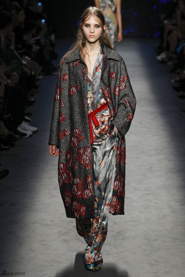 41/61 这简直就是一场刺绣与透视的绝妙盛宴,柔软的绸缎与轻盈的透视蕾丝演奏出令人难以忘怀的古典乐章,夹克混合了男装外套和翻领披肩的设计,又为系列注入了几分惊喜。