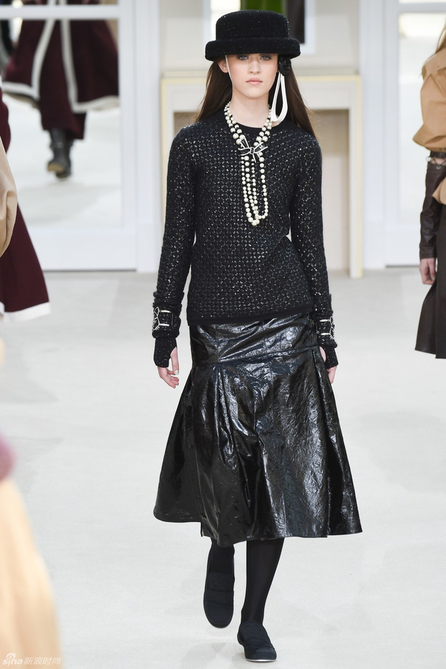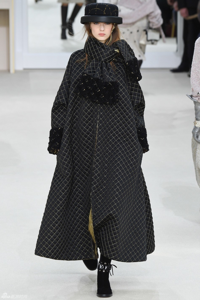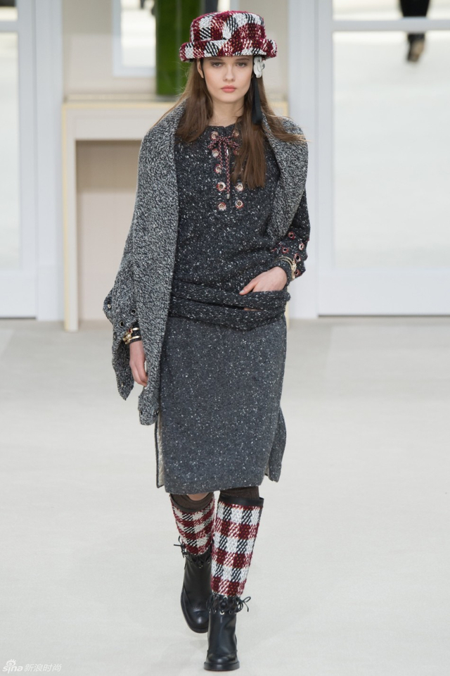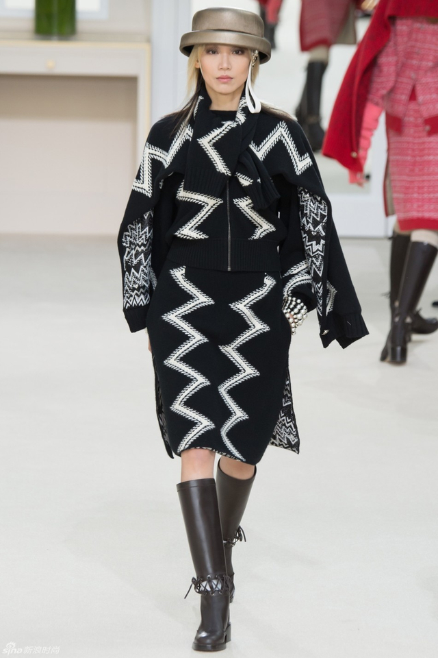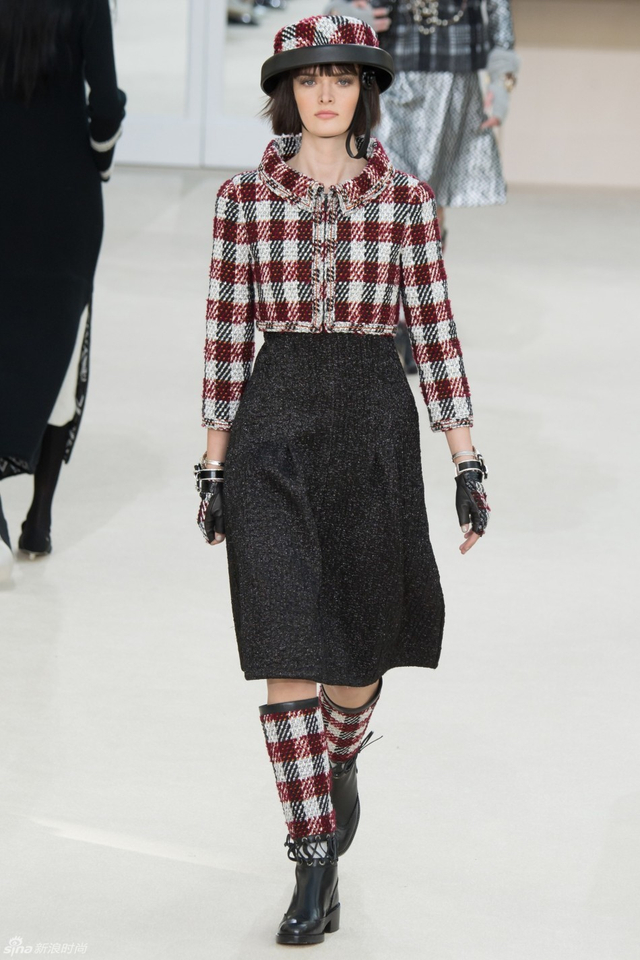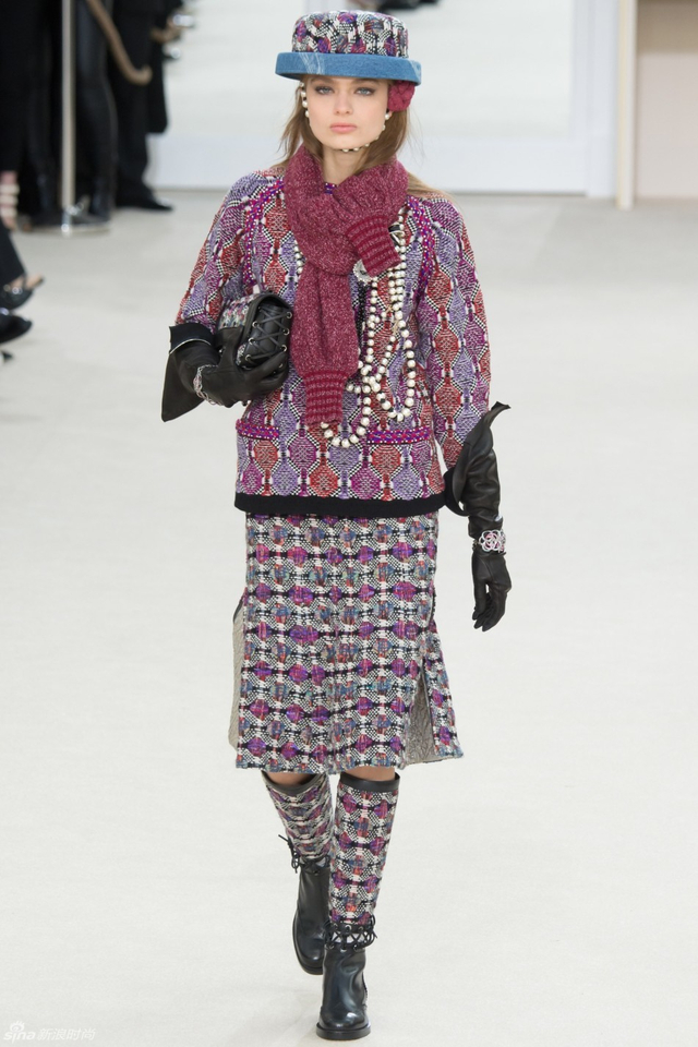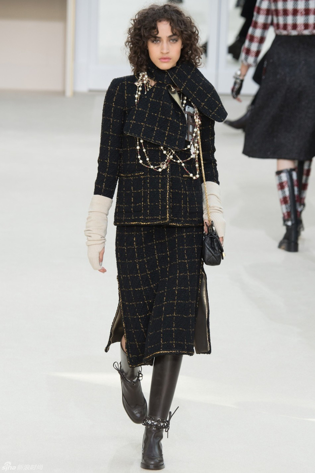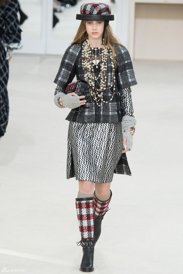 76/94 斜纹软呢的休闲夹克搭配圆顶的礼帽,Chanel小姐的形象勾勒出了一个年轻的形象。经典的格纹和折线纹装饰,让套装散发出了古典的味道,装饰性极强的珍珠项链,Chanel女士挚爱的单品到了新世纪也不乏时尚感。