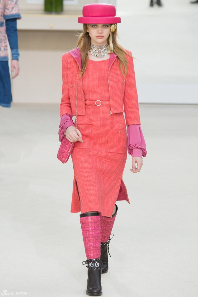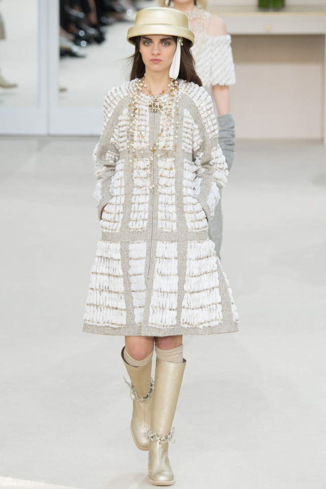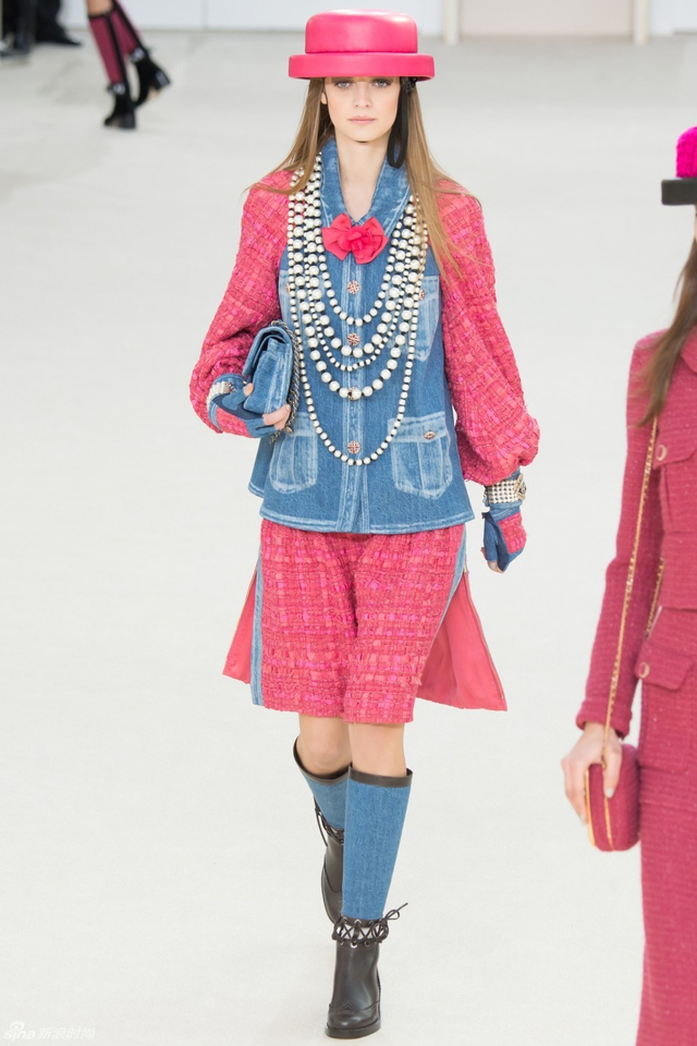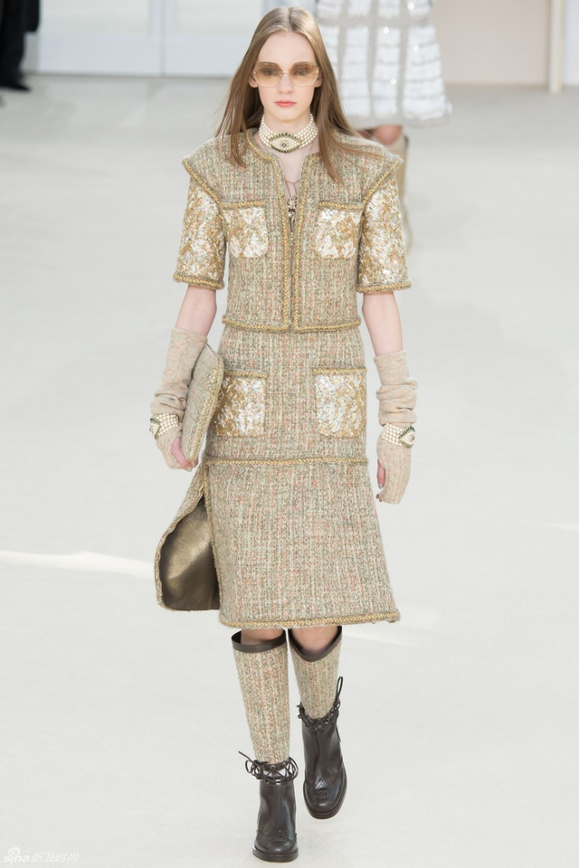 15/94 斜纹软呢的休闲夹克搭配圆顶的礼帽,Chanel小姐的形象勾勒出了一个年轻的形象。经典的格纹和折线纹装饰,让套装散发出了古典的味道,装饰性极强的珍珠项链,Chanel女士挚爱的单品到了新世纪也不乏时尚感。