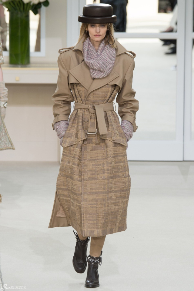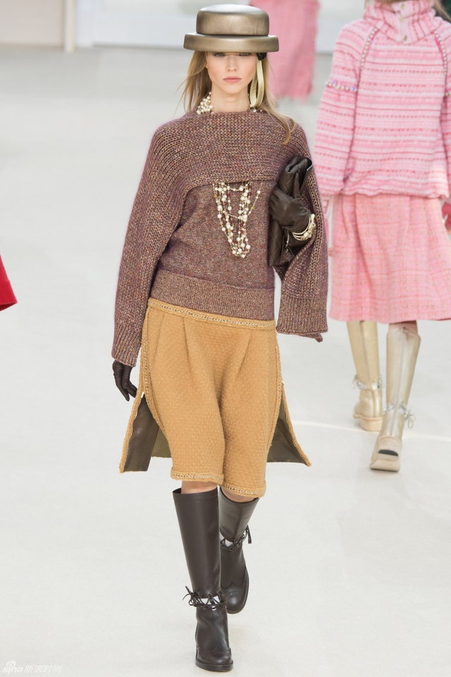 55/94 斜纹软呢的休闲夹克搭配圆顶的礼帽,Chanel小姐的形象勾勒出了一个年轻的形象。经典的格纹和折线纹装饰,让套装散发出了古典的味道,装饰性极强的珍珠项链,Chanel女士挚爱的单品到了新世纪也不乏时尚感。