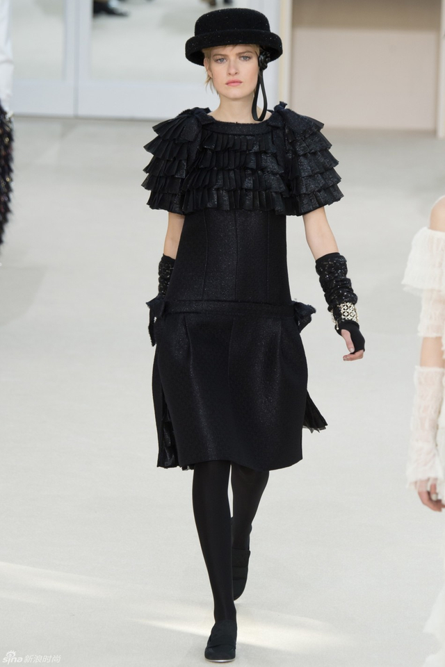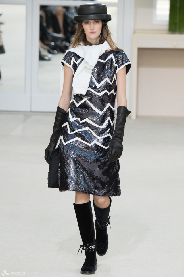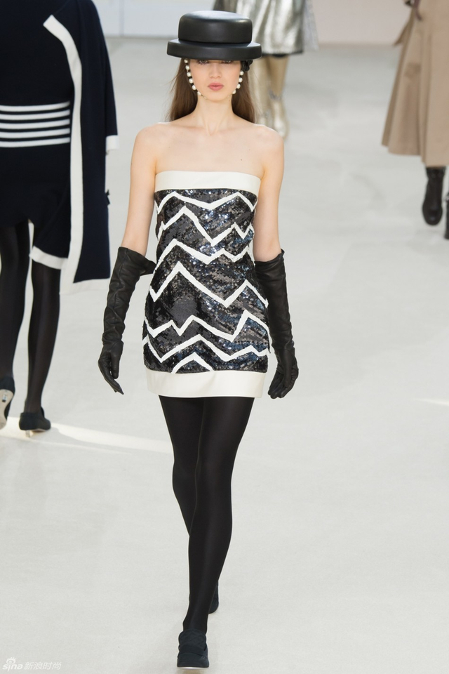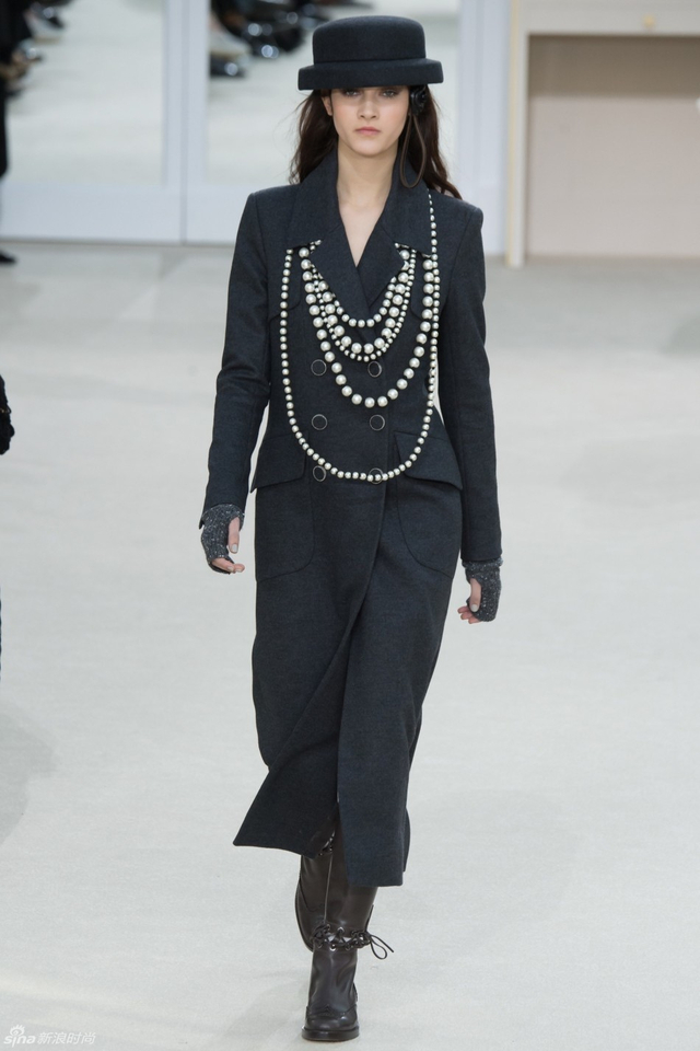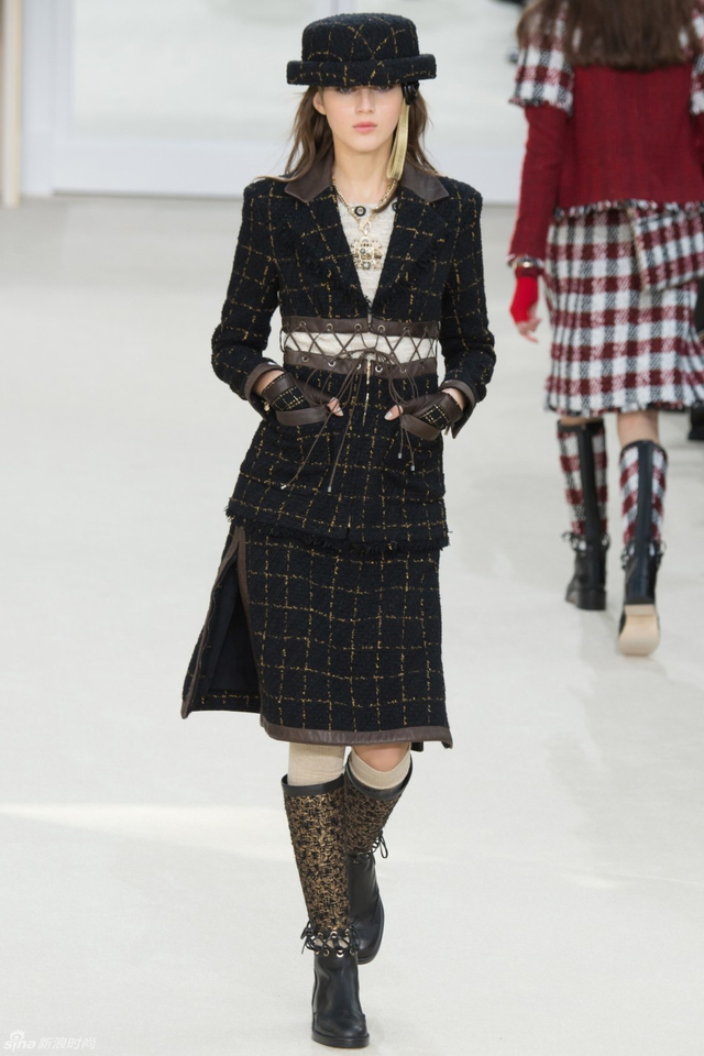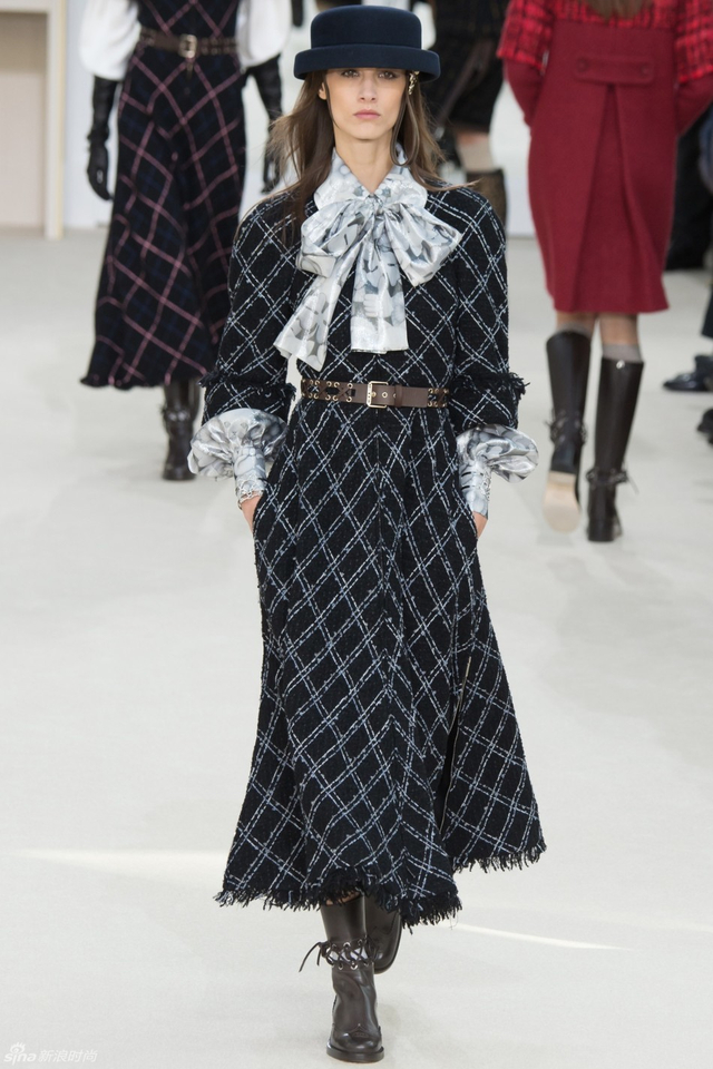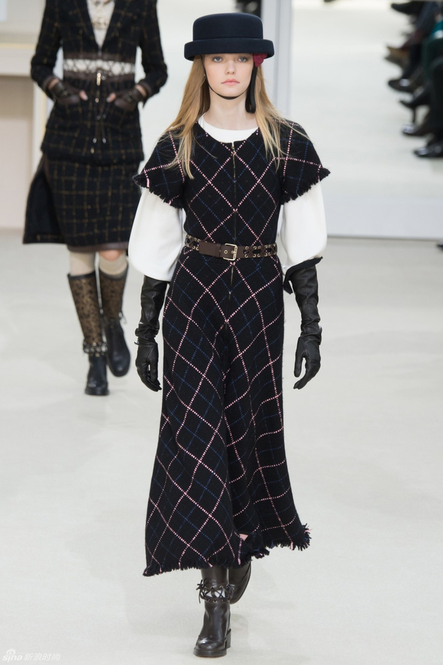 52/94 斜纹软呢的休闲夹克搭配圆顶的礼帽,Chanel小姐的形象勾勒出了一个年轻的形象。经典的格纹和折线纹装饰,让套装散发出了古典的味道,装饰性极强的珍珠项链,Chanel女士挚爱的单品到了新世纪也不乏时尚感。