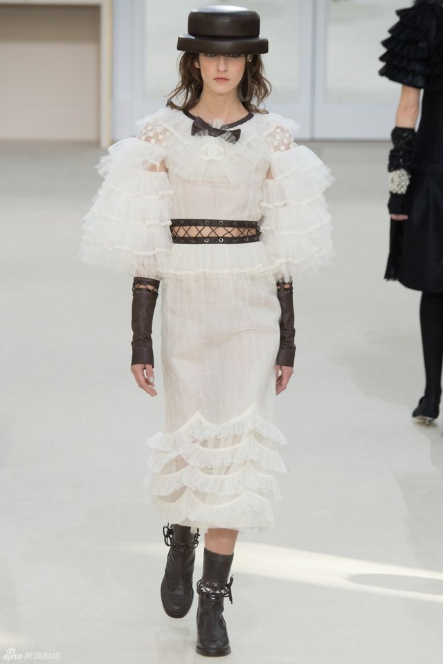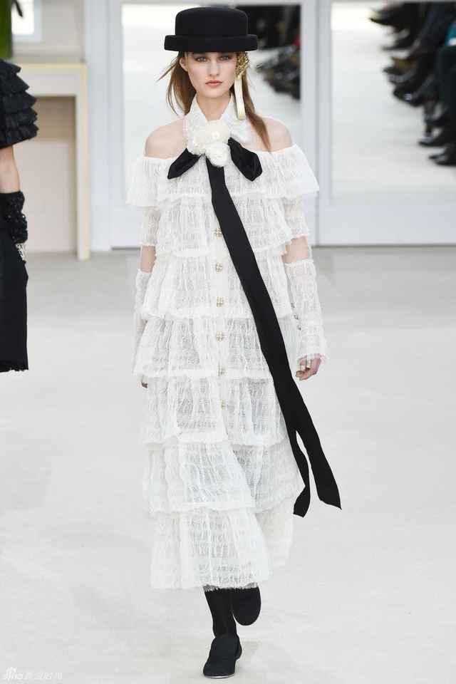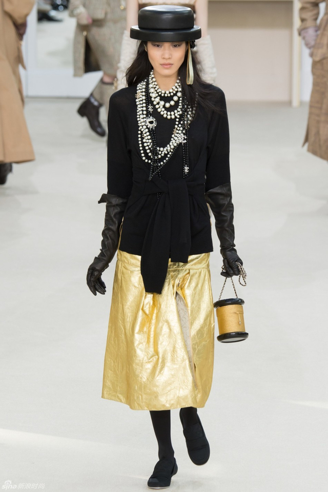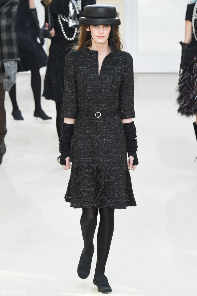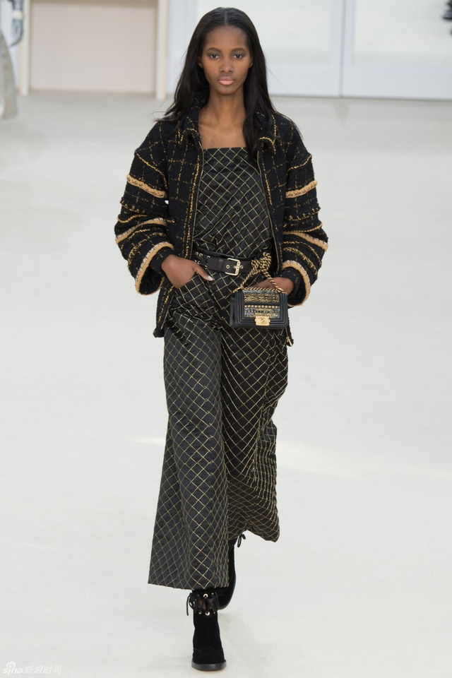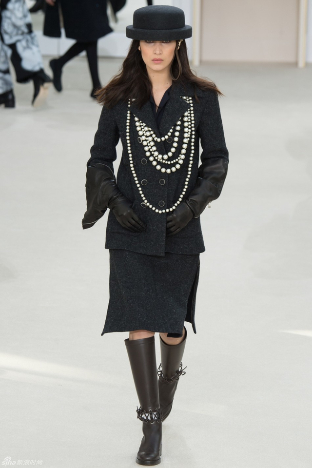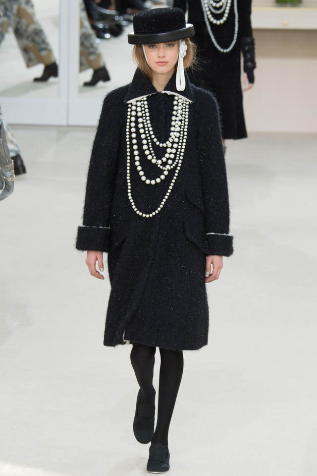 16/94 斜纹软呢的休闲夹克搭配圆顶的礼帽,Chanel小姐的形象勾勒出了一个年轻的形象。经典的格纹和折线纹装饰,让套装散发出了古典的味道,装饰性极强的珍珠项链,Chanel女士挚爱的单品到了新世纪也不乏时尚感。