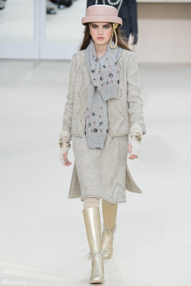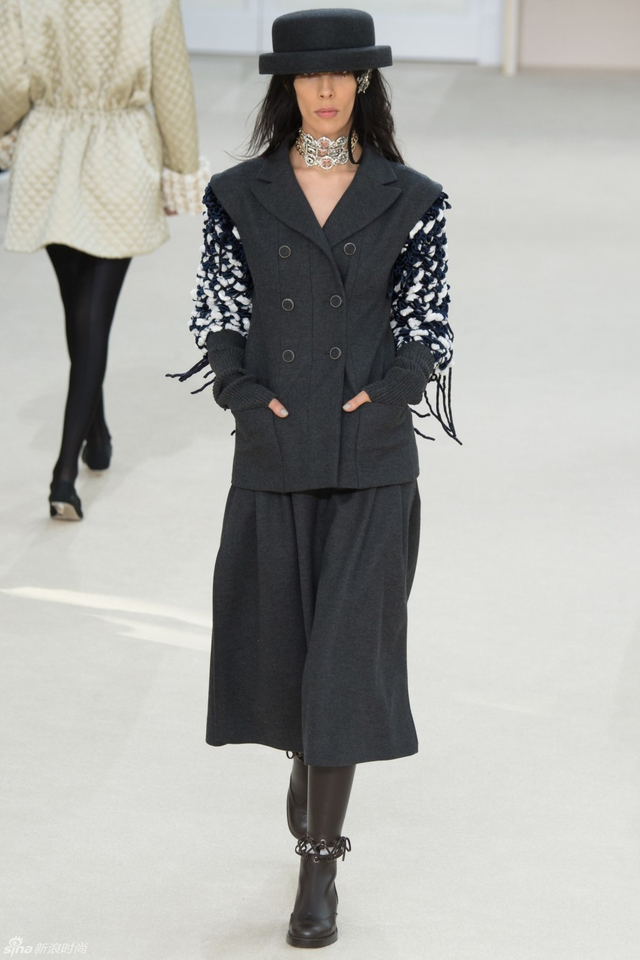 38/94 斜纹软呢的休闲夹克搭配圆顶的礼帽,Chanel小姐的形象勾勒出了一个年轻的形象。经典的格纹和折线纹装饰,让套装散发出了古典的味道,装饰性极强的珍珠项链,Chanel女士挚爱的单品到了新世纪也不乏时尚感。