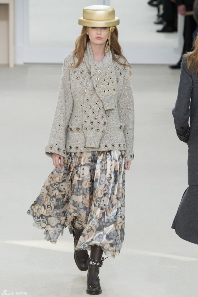 71/94 斜纹软呢的休闲夹克搭配圆顶的礼帽,Chanel小姐的形象勾勒出了一个年轻的形象。经典的格纹和折线纹装饰,让套装散发出了古典的味道,装饰性极强的珍珠项链,Chanel女士挚爱的单品到了新世纪也不乏时尚感。