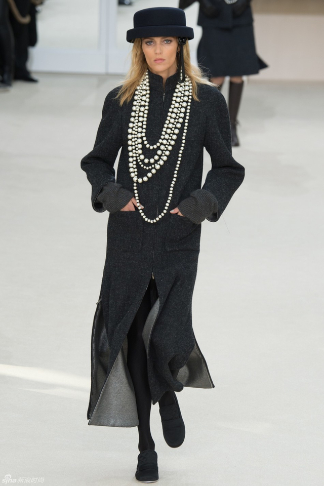 34/94 斜纹软呢的休闲夹克搭配圆顶的礼帽,Chanel小姐的形象勾勒出了一个年轻的形象。经典的格纹和折线纹装饰,让套装散发出了古典的味道,装饰性极强的珍珠项链,Chanel女士挚爱的单品到了新世纪也不乏时尚感。